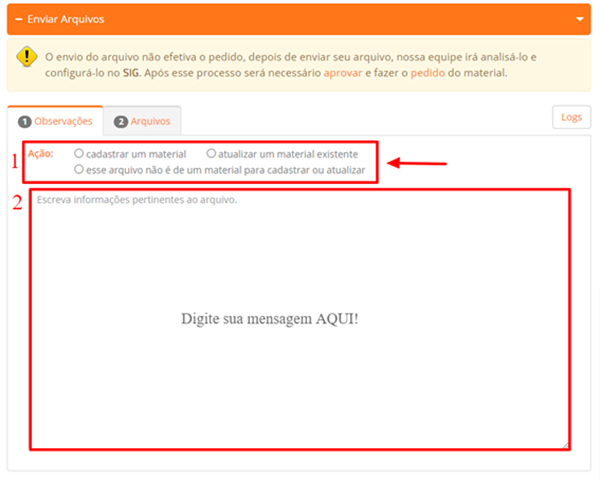 Em "Observações", selecione a ação desejada (destaque 1) e insira as informações relevantes sobre o seu arquivo (destaque 2).